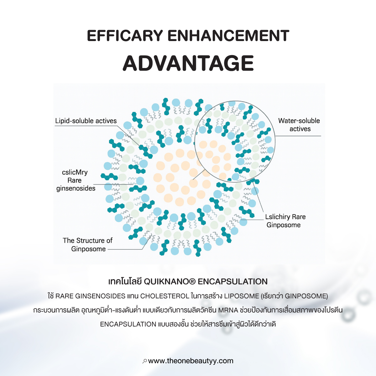 ด้วยเหตุนี้ บริษัท cBioMey (Guangzhou) จึงได้พัฒนา QuikNano® Encapsulated Platform ขึ้นมา เพื่อแก้ปัญหานี้โดยเฉพาะ โดยใช้ Rare ginsenosides หรือจินเซนโนไซด์ชนิดหายาก มาทำหน้าที่เป็น "ผู้ขนส่ง" (Delivery Carrier) ในรูปแบบของ Ginpome ซึ่งเป็นโครงสร้างไลโปโซมที่ช่วยห่อหุ้มสารสำคัญเอาไว้
