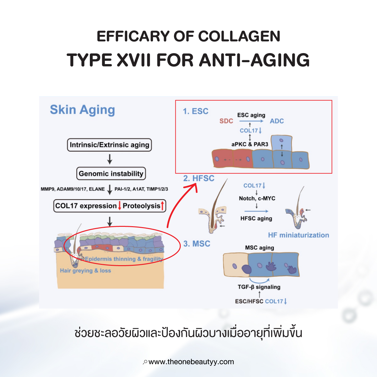 - ลดผมร่วงและยืดอายุเซลล์รากผม: Collagen Type XVII มีบทบาทสำคัญในการรักษาความอ่อนเยาว์ของเซลล์ต้นกำเนิดรากผม (Hair Follicle Stem Cells - HFSC) การลดลงของมันตามวัยทำให้รากผมฝ่อและหลุดร่วงง่ายขึ้น