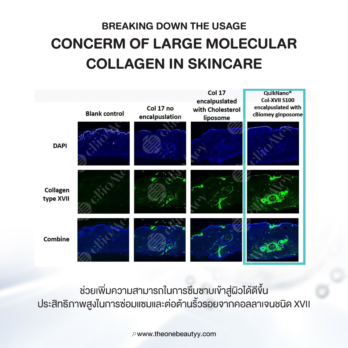 ปัญหาของคอลลาเจนโดยทั่วไปคือ มีโมเลกุลขนาดใหญ่และดูดซึมผ่านผิวได้ยาก แต่เทคโนโลยี QuikNano® Encapsulation ได้เข้ามาทลายข้อจำกัดนี้อย่างสิ้นเชิง
