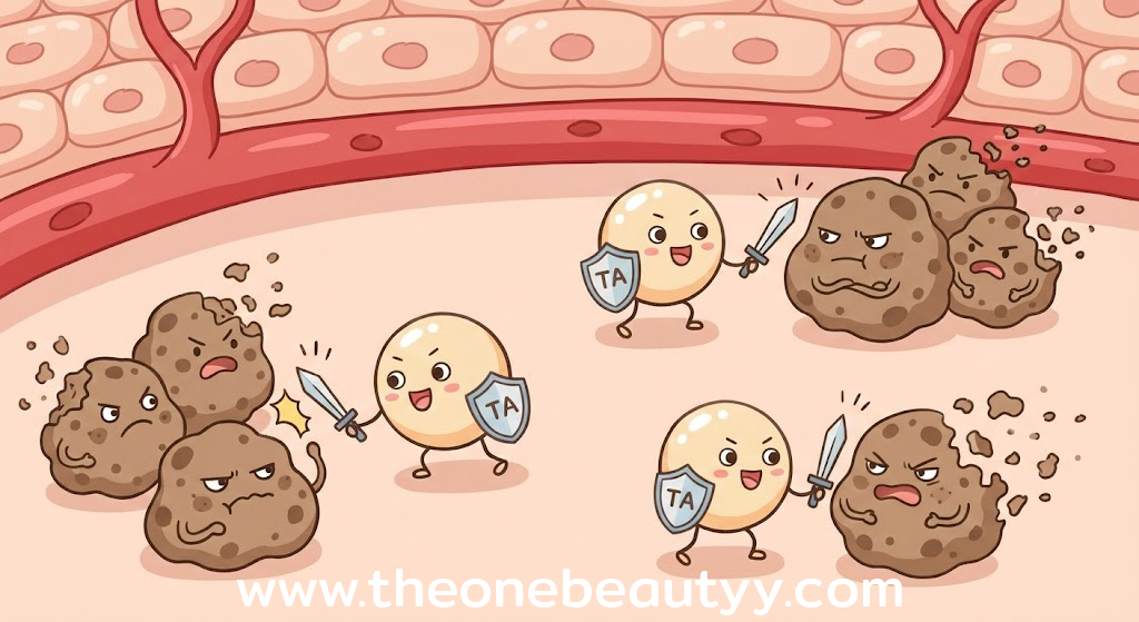 1. ยับยั้งการสร้างเม็ดสีเมลานิน (Antimelanogenesis)- ขัดขวางการทำงานของ Tyrosinase TXA มีโครงสร้างคล้ายกรดอะมิโนไทโรซีน จึงเข้าไปยับยั้งเอนไซม์ไทโรซิเนส (Tyrosinase) แบบแย่งจับ ทำให้กระบวนการสังเคราะห์เม็ดสีเมลานินลดลง