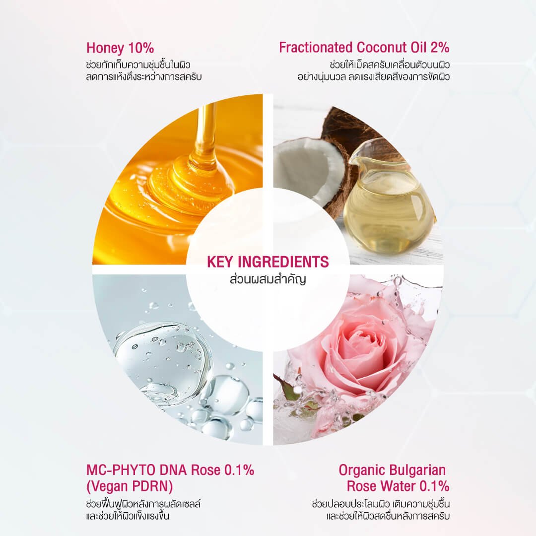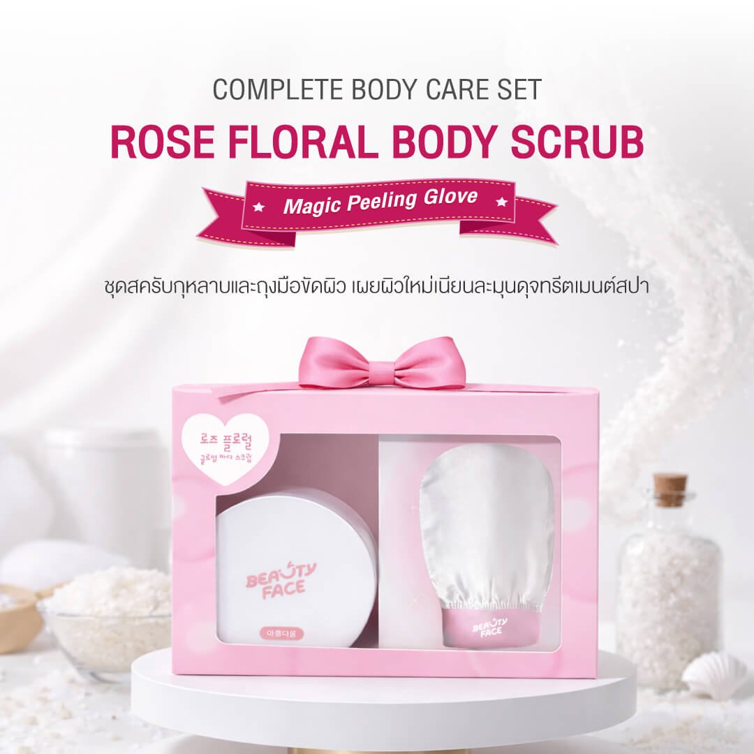 Rose Floral Glowing Body Scrub และถุงมือขัดผิว (Magic Peeling Glove) สครับผิวกายเนื้อครีมเนียนละเอียด ผิวฉ่ำวาว ช่วยผลัดเซลล์ผิวเก่าอย่างอ่อนโยน เติมความชุ่มชื้นด้วยน้ำผึ้งและน้ำมันมะพร้าว พร้อมสารสกัดกุหลาบ ช่วยให้ผิวเรียบเนียน กระจ่างใส