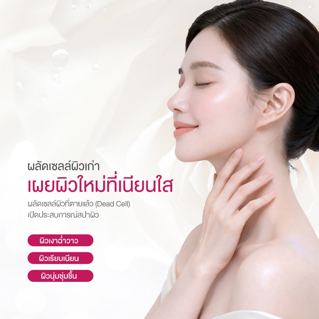 ช่วยผลัดเซลล์ผิวที่ตายแล้ว (Dead Cell) อย่างอ่อนโยน ทำให้ผิวดูเนียนใส เปล่งประกาย และชุ่มชื้นมากขึ้น